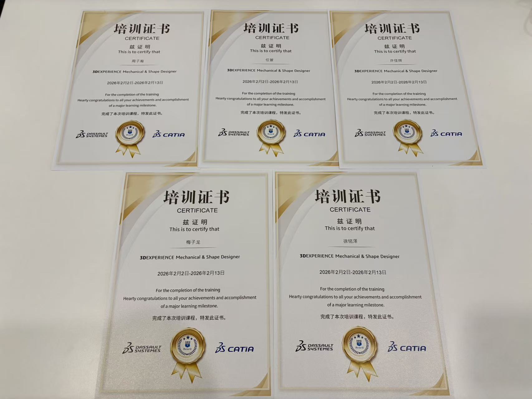 实习期间,全体参与学生参加了达索系统官方线上能力测试。该测试依托3DEXPERIENCE平台学习与评估系统,围绕建模规范、设计逻辑、软件操作熟练度与工程理解能力等多个维度进行综合考核。全员顺利通过测试,获得由达索系统颁发的“3DEXPERIENCE Mechanical & Shape Designer”培训证书。